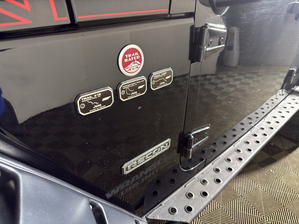 Quick Order Package 23Z Rubicon Recon: 17" X 7.5" Granite Crystal Aluminum Wheels; Heated Front Seats; Low Gloss Black Wrangler Decal; Premium EVIC Message Center; R1234YF A/C Refrigerant; HD Rock Rails with Step Pad; Recon Decals; Black Fuel Filler Door; Recon Package; Accent Stitching; Steel Front Bumper; MOPAR Black Tail Lamp Guards; Air Conditioning with Auto Temp Control; Recon Leather Seats; MOPAR Coat Hooks and Grab Handles; Premium Black Sunrider Soft Top; Red Seat Belts; Midnight Star Interior Accents; Logloss Granite Crystal Jeep Badge; Recon Grille; Hood with Power Dome; Red Switches; Jeep Trail Rated Kit; Red Trail Rated Badge; Dana 44/226MM Rear Axle; Dana M44/216MM Front Axle; MOPAR Slush Mats with Red Accents; Red Front and Rear Tow Hooks; Recon Badge; Steel Rear Bumper. Connectivity Group: Vehicle Information Center; Remote USB Port; Uconnect Voice Command with Bluetooth®; Tire Pressure Monitoring Display. 430 Nav Radio. Black 3-Piece Hard Top. **Equipment listed is based on original vehicle build and subject to change. Please confirm the accuracy of the included equipment by calling the dealer prior to purchase.**