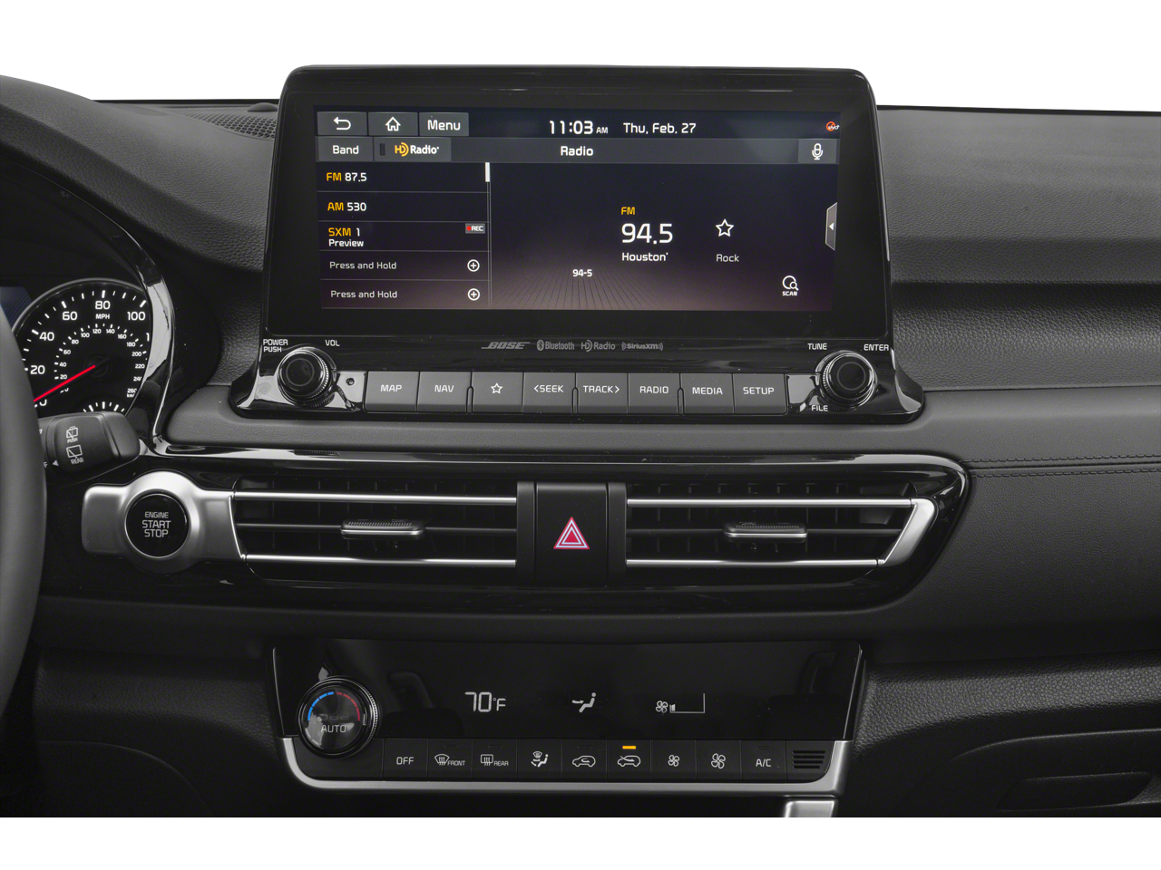 - Radio: AM/FM/MP3 Display Audio -inc: 10.25" touch screen display, navigation, satellite radio, UVO telematics, Bluetooth wireless technology w/voice recognition, Android Auto, Apple CarPlay, Bose premium audio and sound, wireless charging pad, 12V power outlet, USB multimedia port and steering wheel mounted controls
