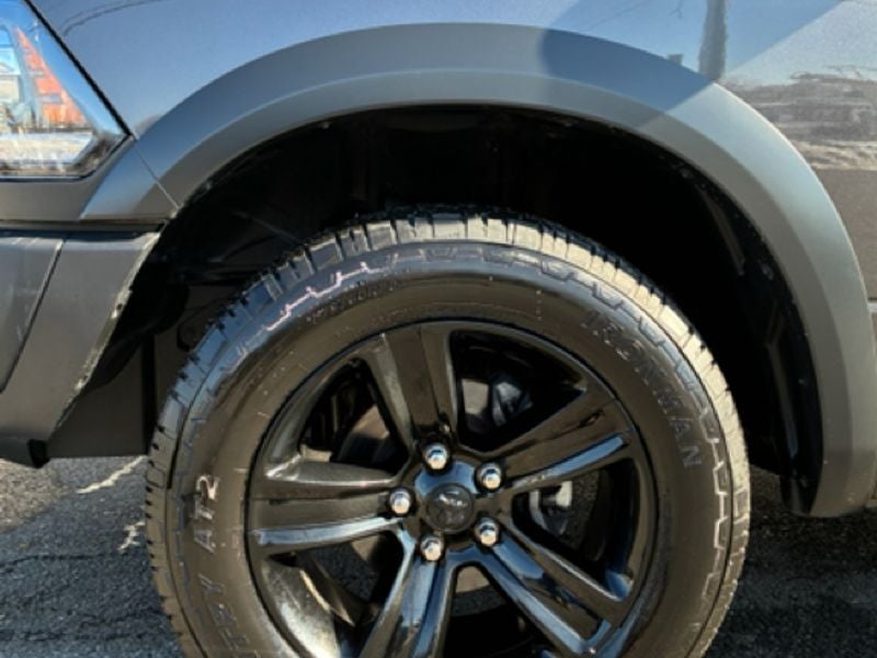 Quick Order Package 29F Warlock: Black Powder Coated Rear Bumper; Black RAM Head Tailgate Badge; 4x4 Flat Black Badge; B-Pillar Black Out; Semi-Gloss Black Hub; Bi-Function Halogen Projector Headlamps; Raised Ride Height; P275/60R20 BSW AS Tires; Rear Extra Heavy Duty Shock Absorbers; Sport Tail Lamps; Black Exterior Truck Badging; Black Powder Coated Front Bumper; Warlock; Black Grille with RAM Lettering; Black Headlamp Filler Panel; Front Wheel Well Liners; Warlock Interior Accents; ParkSense Rear Park Assist System; Goodyear Brand Tires; Black Wheel Flares; 20" X 9" High Gloss Black Aluminum Wheels. Granite Crystal Met CC. **Equipment listed is based on original vehicle build and subject to change. Please confirm the accuracy of the included equipment by calling the dealer prior to purchase.**